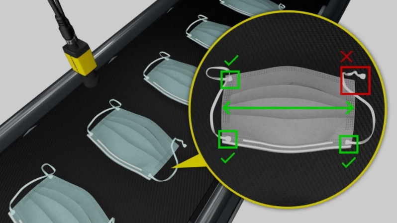 康耐視 In-Sight 8402視覺系統可以檢測口罩元件是否存在缺陷,例如耳帶以及結合點,同時測量口罩寬度以保證其尺寸正確。很多缺陷是傳統機器視覺演算法難以預測和程式設計的,康耐視深度學習只需使用50個樣本圖像即可輕鬆定位和分類隨機缺陷,例如撕裂、污漬和縫紉錯誤等,從而確保口罩品質,使其擁有良好防護效果。