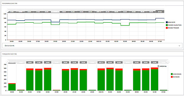 DataMan 280 結合使用康耐視邊緣智慧 (EI) 提供先進的工業 4.0 功能,例如輕鬆進行網頁瀏覽器連線、裝置管理及性能監視。其可讓使用者一次設定多部裝置,並在數分鐘內開始觀察重要的系統性能指標趨勢。工廠經理可識別趨勢,並在性能下降時迅速介入。