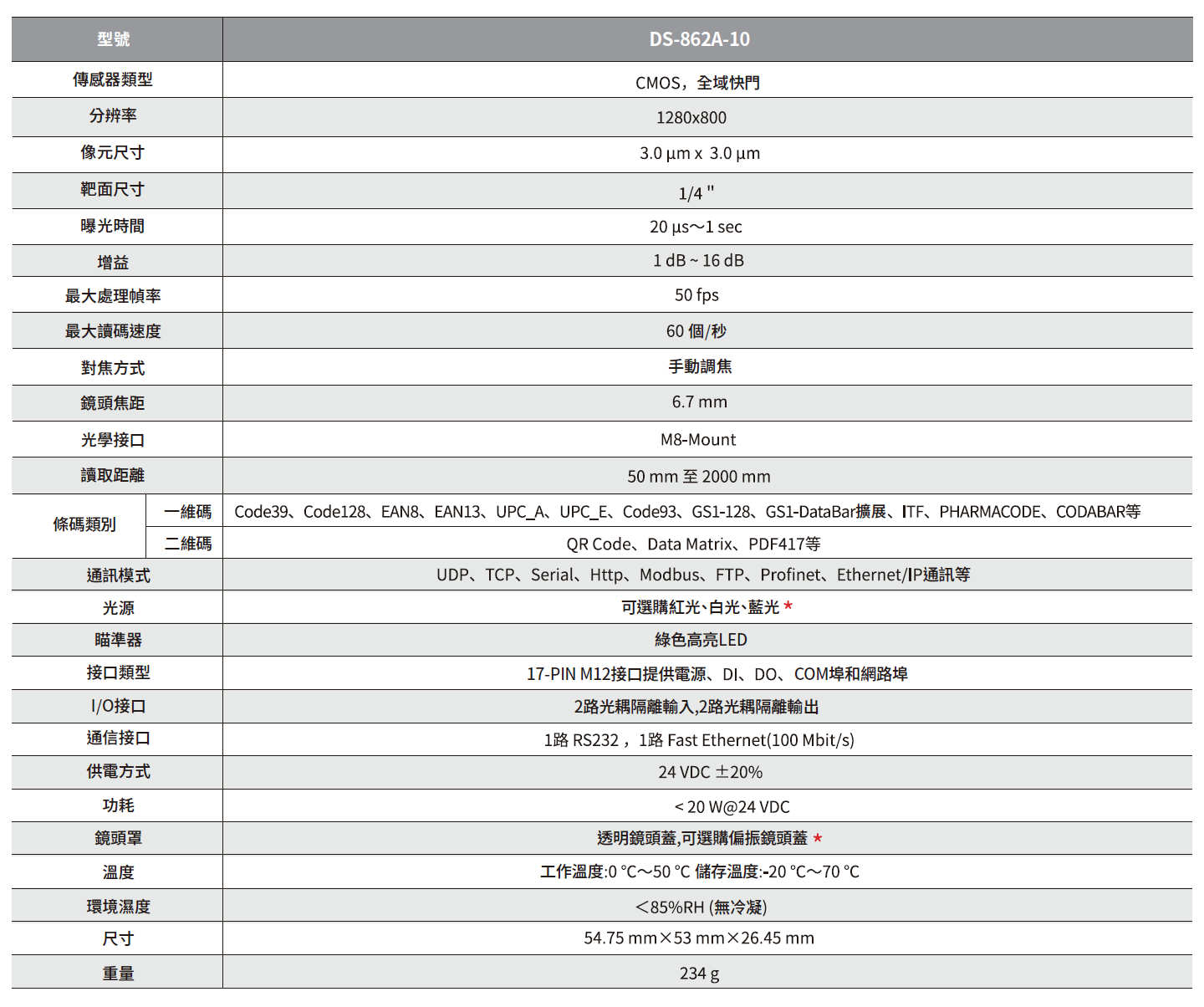 CUBIC DS-862A-10產品特點 選用高性能圖像傳感器。 外型小巧、緊湊,適應更多工業應用場景。 具備手動調焦。 支援TCP/IP、Serial、FTP、HTTP等傳輸協議。 內置深度學習讀碼算法,高效讀取各類條碼及二維碼,無懼髒污和破損等干擾。 I/O接口豐富,可接入多路輸入及輸出信號。