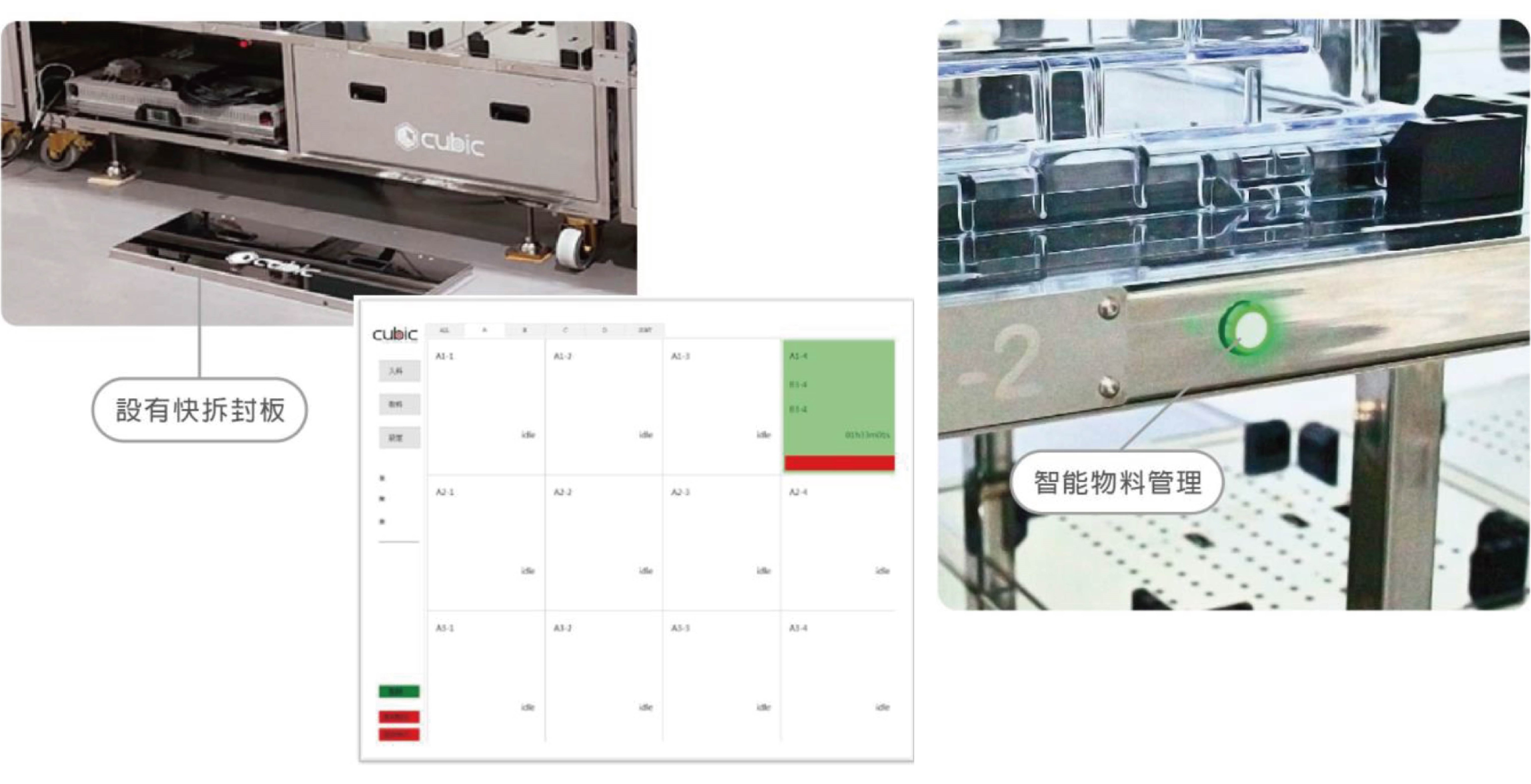 Cubic E-rack 取代傳統庫存方式,自動更新架上庫存資訊,確保資訊的正確性,即時顯示工序減少人員的管理程序,增進管理效率。能有效監管晶圓盒在製品/治具…等位置,以免貨物遺失適時警示Operator,如Waiting Timeout,提升生產效率,管控生產進度,建立生產履歷。
