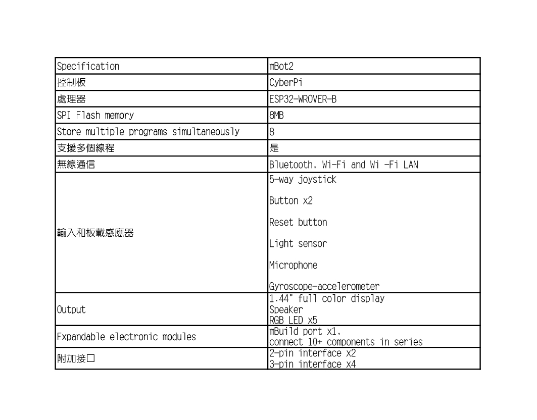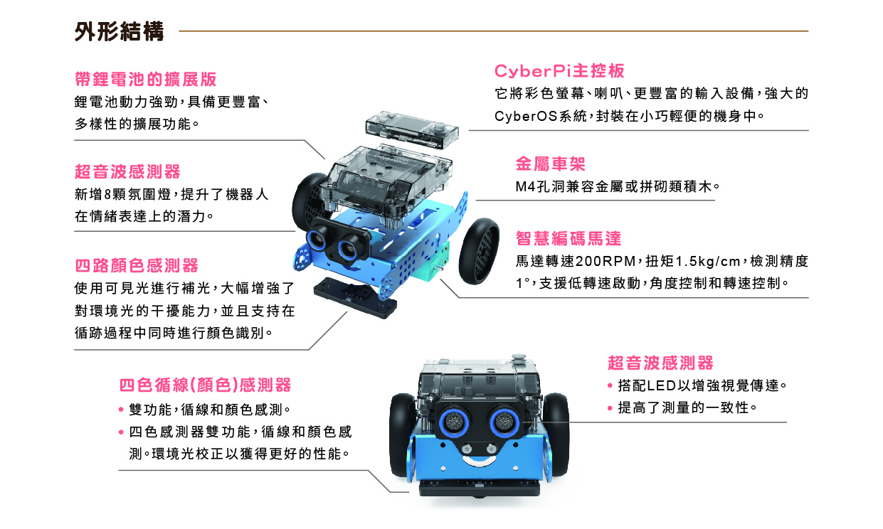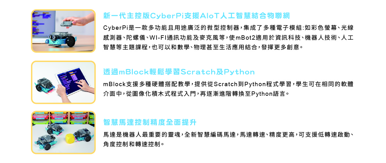mBot2教育編碼機器人 mBot2是一款入門級的STEAM教育機器人,專為資訊科技、程式語言學習而生。 【產品特色】 搭載先進的微控制器CyberPi,具有網路功能,使教育工作者能夠進行高度互動和智能的課程,實現多個設備之間的通訊。 適用於小學高年級到高中的教師和學生,mBot2套件專為教學和學習程式設計、科學和機器人技術而設計。 mBot2設計簡單,開箱即用,並具有強大的擴充功能,可連接外部擴充模組和不同感測器,以適應各種專案和教育環境。