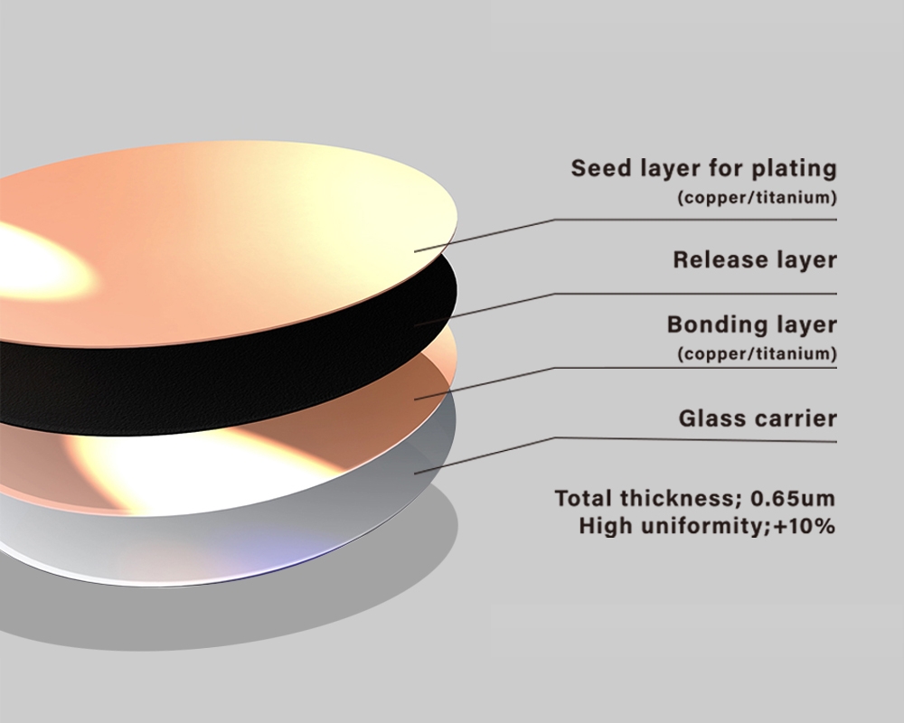 應用於扇出型先進封裝, Carrier上面帶五層功能性結構層,超薄化五層厚度僅0.65um。