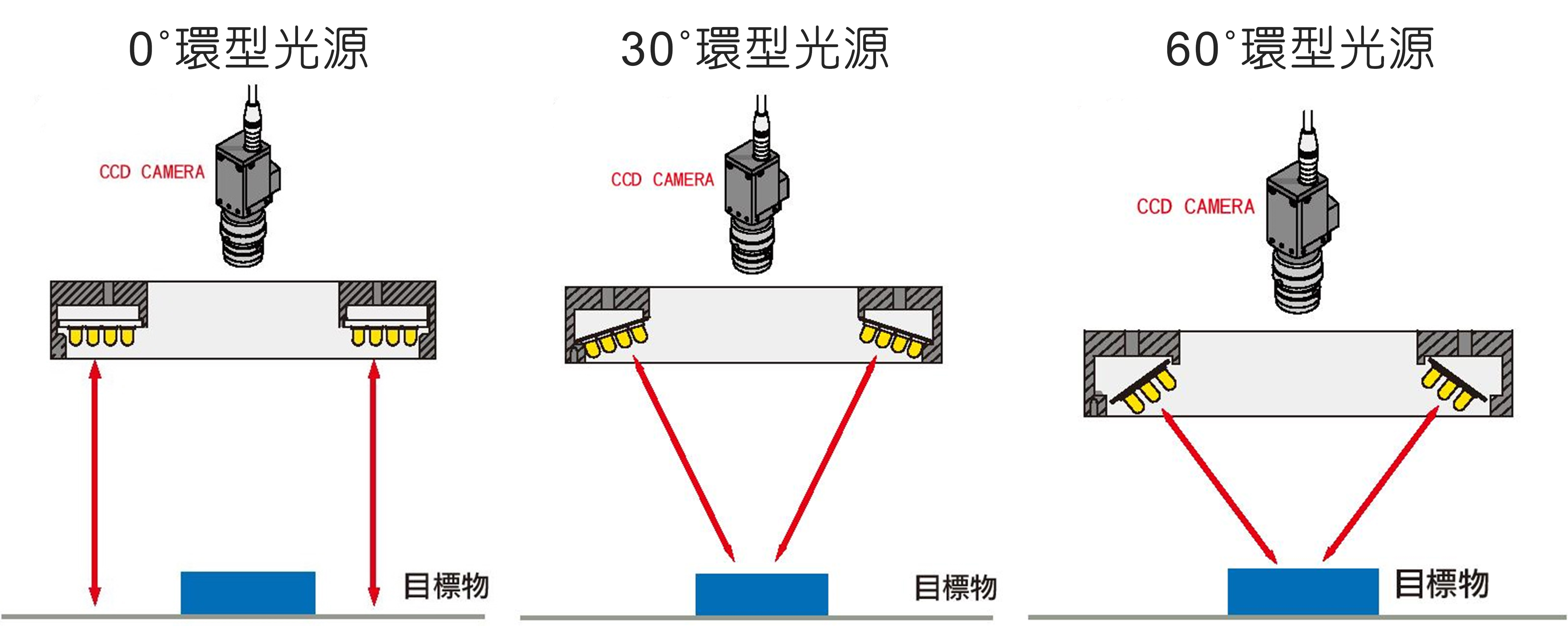 0°環型光源 / 30°環型光源 / 60°環型光源 0°環型光源 輸入電壓: 12V/24V 30°環型光源 輸入電壓: 12V/24V 60°環型光源 輸入電壓: 12V/24V 環型水平對照光源 輸入電壓: 12V/24V