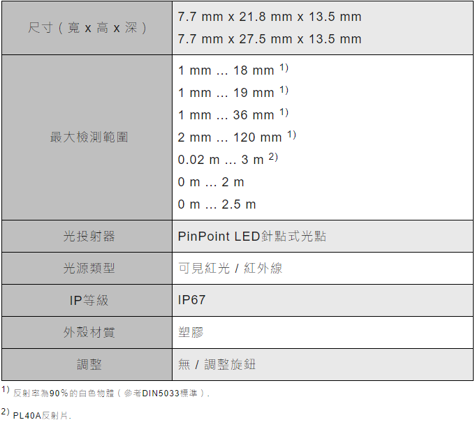 - 為確保大範圍檢測與可靠的物件識別,所有產品系列均有PinPoint LED針點式光點