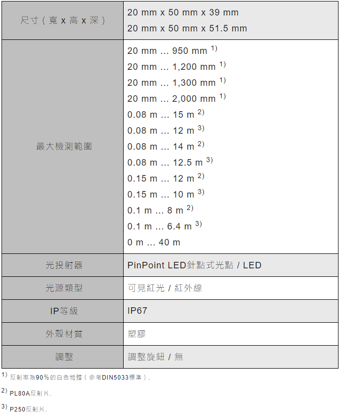 - 檢測範圍大:帶背景遮蔽功能的為1200 mm ,PL80A反射片為15m