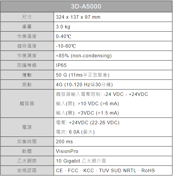 康耐視COGNEX的 3D-A5000 系列是面陣掃瞄三維攝影機,設計來擷取高解析度三維圖像。採用三維 LightBurst 技術,迅速採集圖像以較大程度提高輸送量。高解析度三維圖像結合領先業界的康耐視三維視覺工具,就是裝配驗證,於生產線上進行測量以及機器人引導等應用可靠又精準的解決方案。