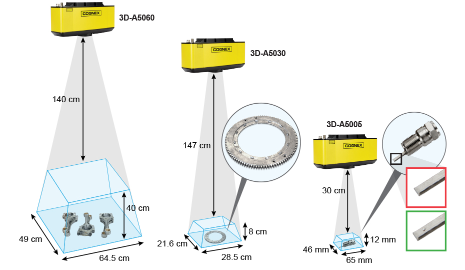 康耐視COGNEX 3D-A5000 可因應汽車,消費性產品及物流業中的應用,提供各種不同視野與測量範圍。其他功能特徵與優點包括: