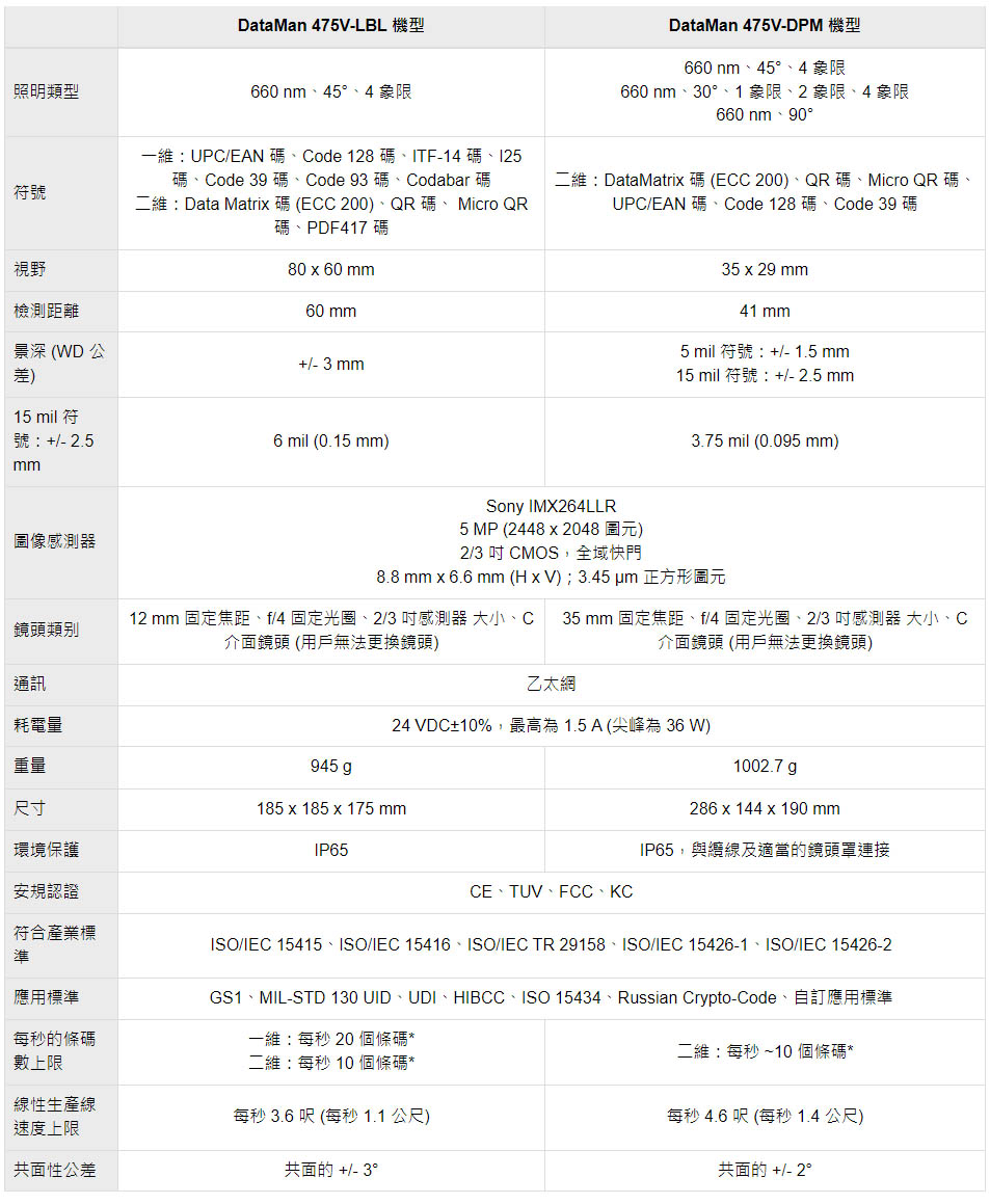 DataMan 475V-DPM 使用多象限照明配件照亮紋理、彎曲和高反射性表面上的條碼,並可選擇 30S、30Q、30T、45 和 90 度照明選項。該型號符合 ISO 標準,可以根據 ISO/IEC TR 29158 (AIM DPM) 標準分級條碼。