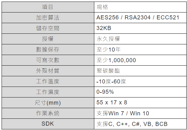 產品介紹 首創高速加密演算法 高性能智慧卡晶片規格 每次的通訊皆使用一次性的密鑰 可針對應用程式、資料庫、檔案、硬碟進行加密 應用程式和保護鎖的通訊,使用非對稱性算法 免驅動程式,隨插即用 系統需求 : Win7/8/10 標準外型尺寸 : 45x15x7 mm 優勢 防盜: 機台關鍵零組件,晶片植入保護。 維護: 操作維修人員,分級授權保護。 唯一: 可指定型號、功能做為唯一身份。 事件: 針對設備狀況進行機台鎖定。 時間: 可設定時間週期,搭配事件、維護等。 加密比較